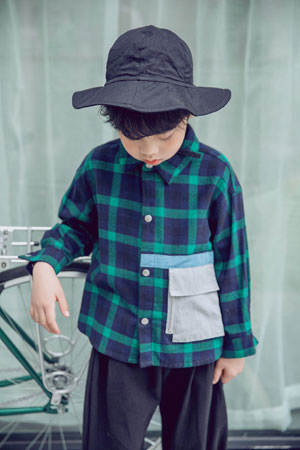 童裔格子衬衫多以黑白作为底色,主体颜色可以稍微夸张一点儿,穿着的时候可把衬衫扎进裤子里,既起到了点睛的作用,还能让整体搭配看上去更有活力。